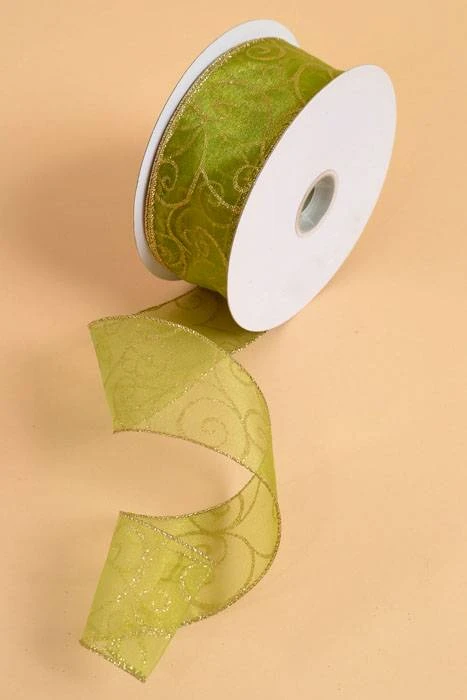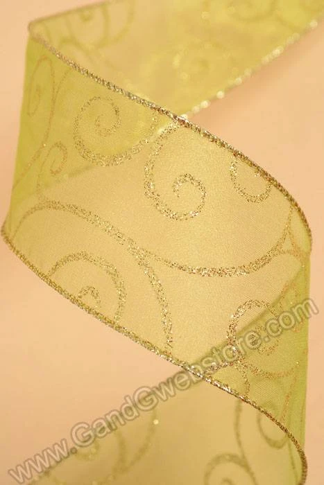 2.5″ X 50YDS GLITTER SWIRL SHEER WIRED RIBBON SPRING MOSS/GOLD